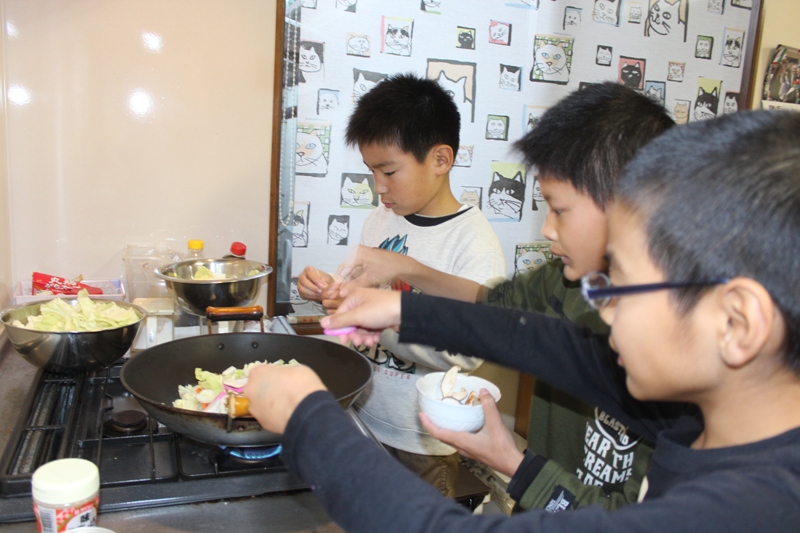 ちゃんぽん鍋で、中華鍋で野菜や肉を炒め下ごしらえを