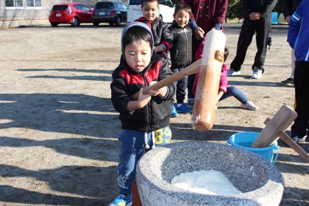最年少のこうちゃんも子ども用の杵で一人でもちを